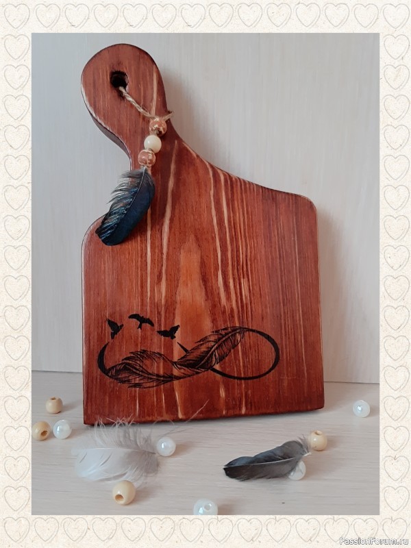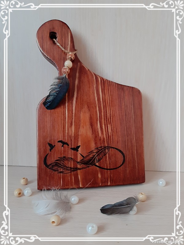 выпилила заготовку, прошкурила. Далее покрыла морилкой, после просушки лаком 2 раза. Вживила распечатку. Сверху снова лак. Обратная сторона покрыта воском. Досочку можно использовать, как подставку или для подачи нарезки. А можно ею просто украсить свою любимую кухню.