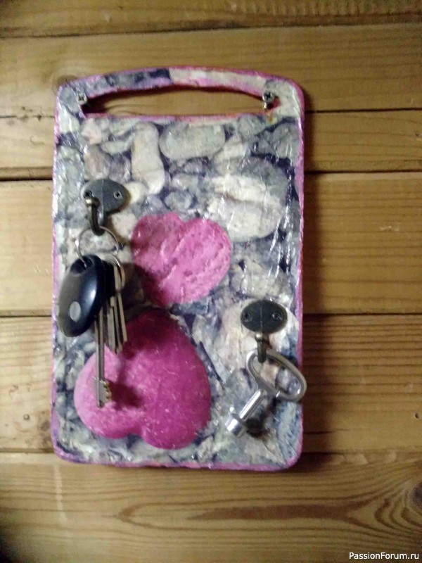 использовалась старая пластиковая досточка, которую на мусорку пора. Шпатлевка по дереву с ПВА. Салфетка, подрисовка. фурнитура под бронзу, и готова ключница.