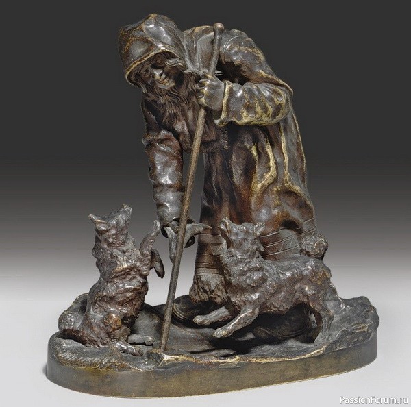 "Алеут, кормящий рыбой собак". Бронза фабрики К. Ф. Верфеля по модели В. Я. Грачева. Санкт-Петербург. Высота 16 см.