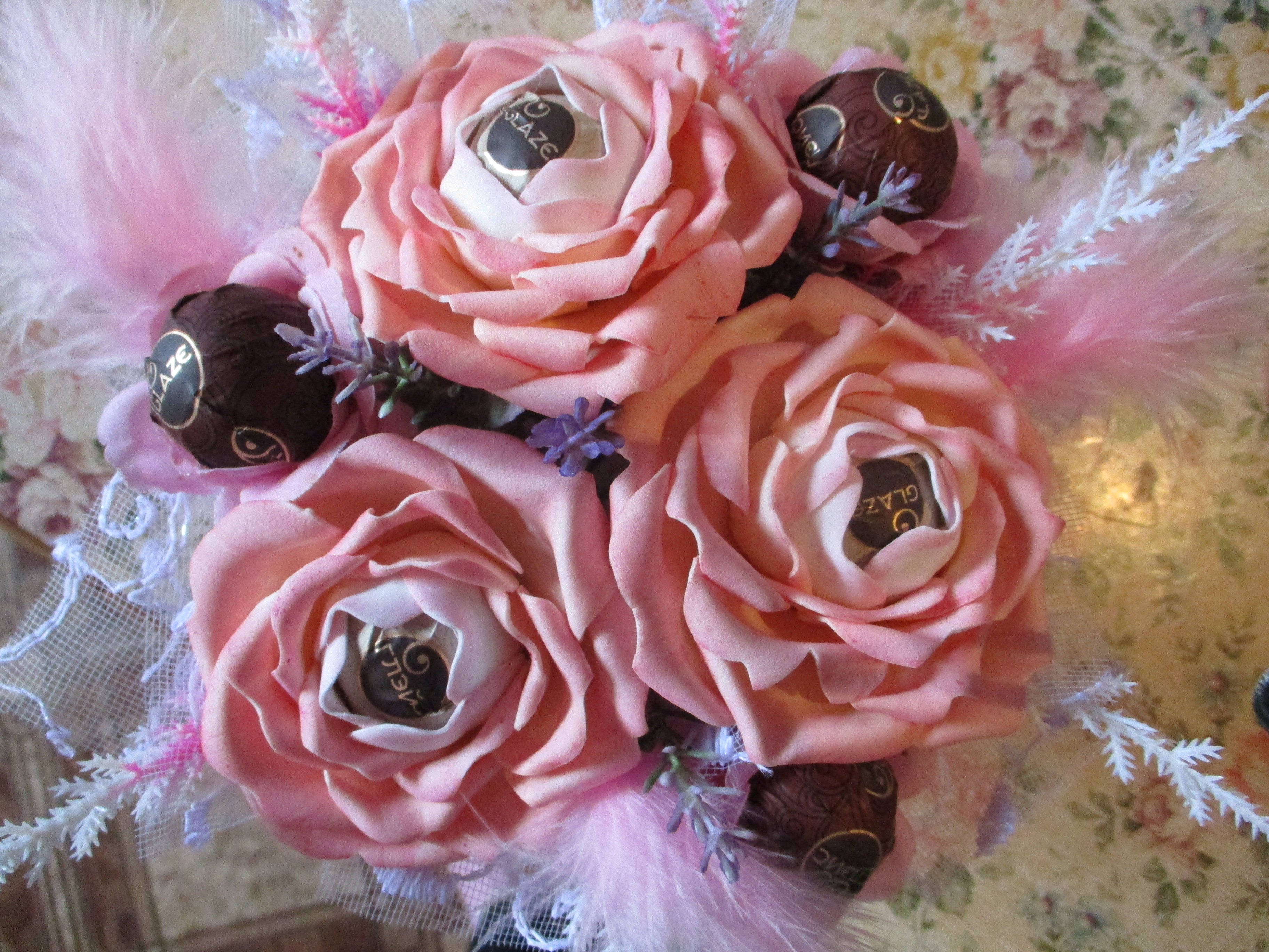 Всем доброго времени суток! Насмотрелась я на наших рукодельниц, да ещё и видео в ютубе,захотелось мне тоже попробовать. Сначала долго изучала,как делать цветы из фоамирана,научилась,теперь научилась-как делать конфетный букет.Собрала всё воедино, и вот что получилось!