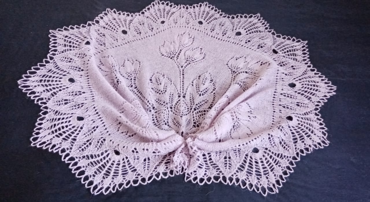 не терпится похвастаться. только закончила еще одну шаль ! шаль #тюльпановое_настроение связана из рассказовской ниточки-100% шерсть, метраж 600м на 100 гр. вес шали 104 грамма, размер 79х140х300. спицы №3, крючек для закрытия №2.