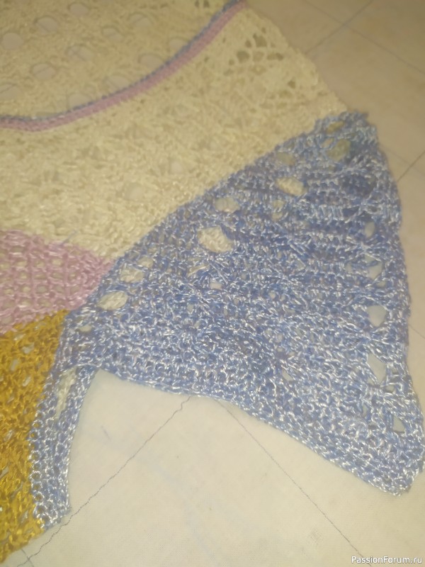 Опять моя любимая пряжа! У неё такие пастельные оттенки!!! В платье смотрятся очень хорошо и модель интересная! Скажите это ваша сестра пожелала низ с запахом или это ваше ей предложение? Эдакая курортная дама получилась!!! А если разрез заколоть красивой булавкой можно и в свет выгуливать.