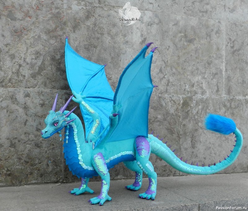 Длина дракона от носа до кончика хвоста 127 см. Размах крыльев 108 см, высота в холке 18 см, высота по голову 38 см, высота с поднятым крылом 72 см. Полностью гибкая и подвижная от пальцев лап до крыльев. Дракон прекрасно держит позы и равновесие. Подушечки на пальцах обработаны, зверь не скользит на гладких поверхностях.