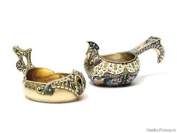 Два серебряных ковша с позолотой и перегородчатой эмалью (длина большего ковша 15 см), Овчинников, Москва, 1908-1917 гг.