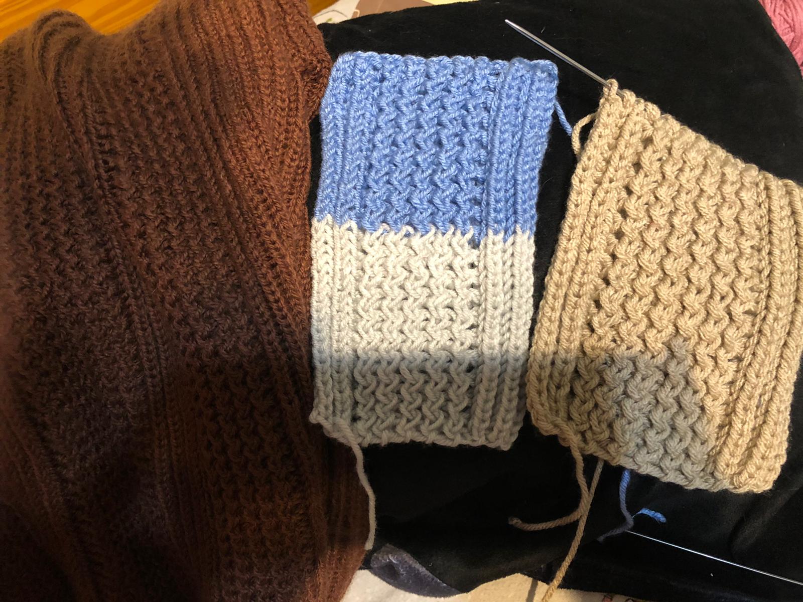 Вот этот замечательный момент .Свитер коричневый под рукой и первые образцы