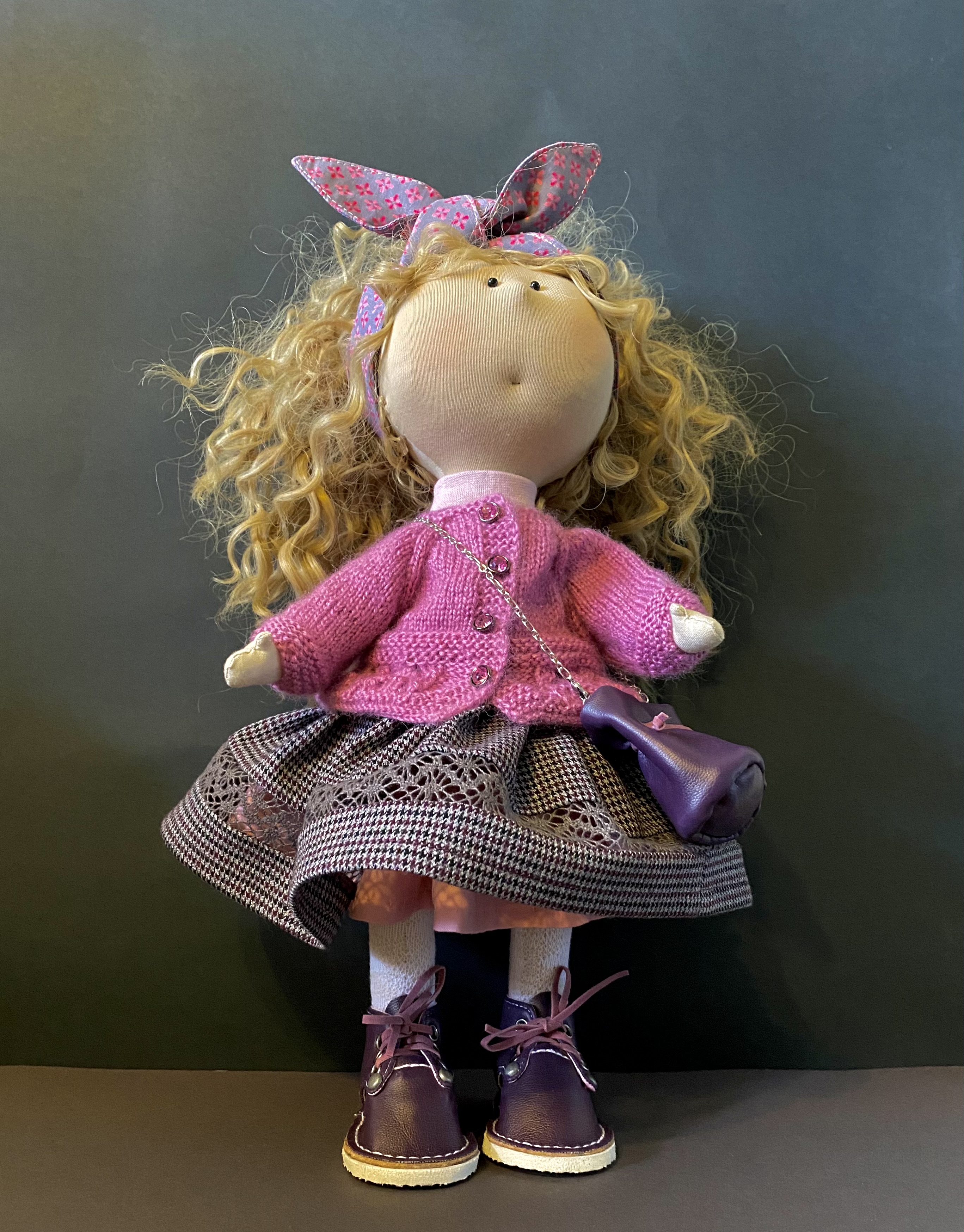 В детстве у меня была кукла - одна! Одна не потому, что не было возможности купить другие, просто одной было достаточно. Она и сейчас есть, жива и здорова. Только захотелось еще. Муж говорит: "О пенсии пара думать, а она в куклы надумала играть". Видимо время пришло. Вообще кукол шить очень интересно: подбирать материал на одежду, придумывать и шить сумочки, ботиночки, примерять волосики. Для последней бегала по всему городу в поисках кожи подходящей расцветки. Для неё же научилась вязать кофты. Все куклы высотой 30 см. Вся одежда и обувь у них съемная, так что можно поменять гардероб в любое время. У первой есть несколько фотографий процесса создания, я ими тоже поделюсь. И вообще она самая любимая. Кукол шью только зимой и слякотной весной, поэтому сейчас хочу показать трех, до конца готовых. Выкройки самой куклы нашла в интернете, они есть в свободном доступе. А все остальное - это фантазия и немного навыка, который обязательно приходит с каждой сшитой барышней!