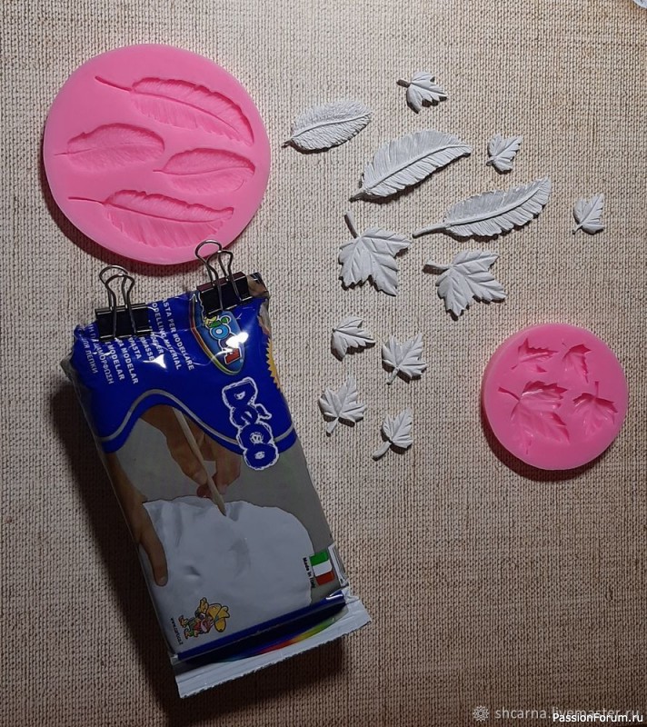 Теперь книга готова и можно приступать к непосредственному декору. Но прежде я сделала детали, которыми буду украшать книгу дальше. Их лепила из самозатвердевающей массы с помощью силиконовых формочек, пока бутылочка сохла.
