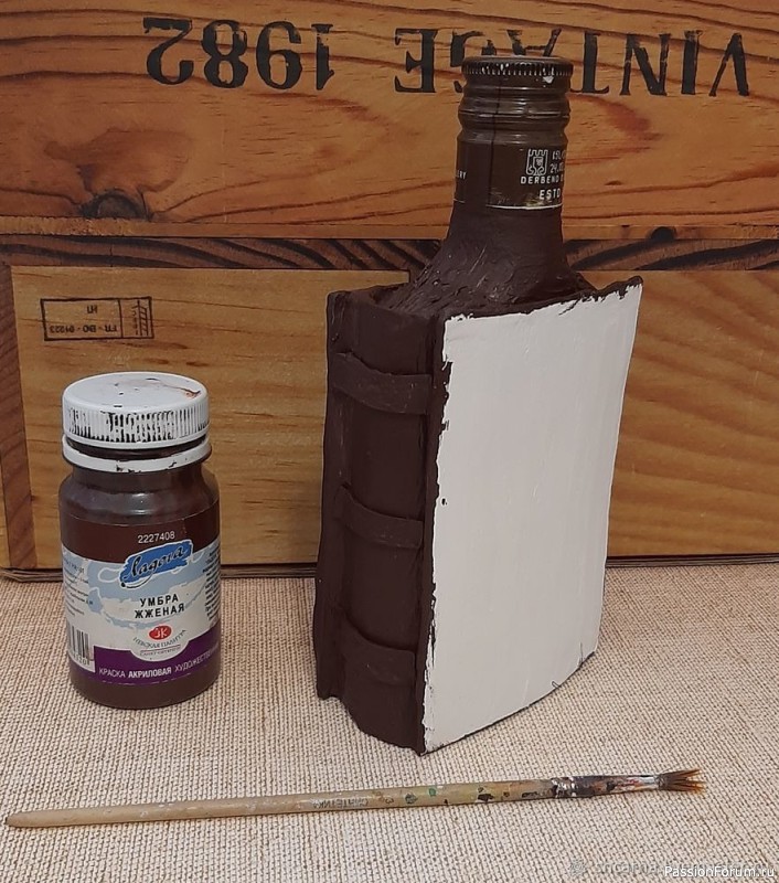 В качестве объекта для декора я взяла небольшую бутылку с горячительным напитком. То есть, подчеркиваю, украшать будем сосуд наполненный, который потом можно использовать как подарок мужчине.