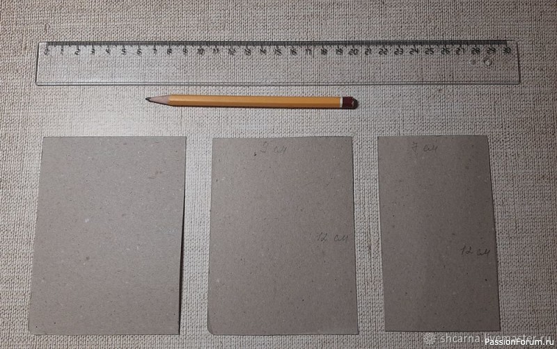 Пока всё это сохнет, делаем основу для книги. Вырезаем из неплотного картона (у меня обычная канцелярская папка) обложку и переплет размерами 9х12 см и 7х12 см.