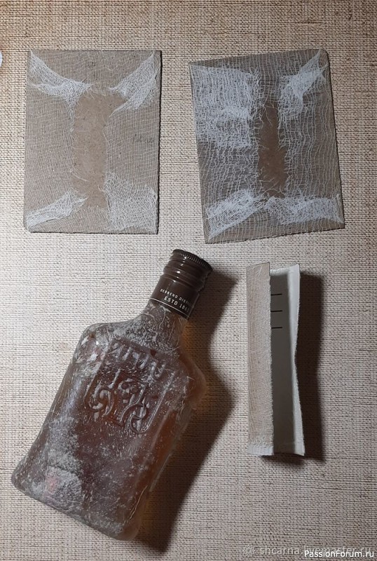 Оклеиваем детали марлей. Кладем под пресс и тщательно просушиваем, чтобы потом детали не повело. Деталь для переплета сворачиваем полукольцом (я закрепила её в этой форме на просушку канцелярскими резинками). Сушилось всё около 12 часов. В итоге получаем такие заготовки: