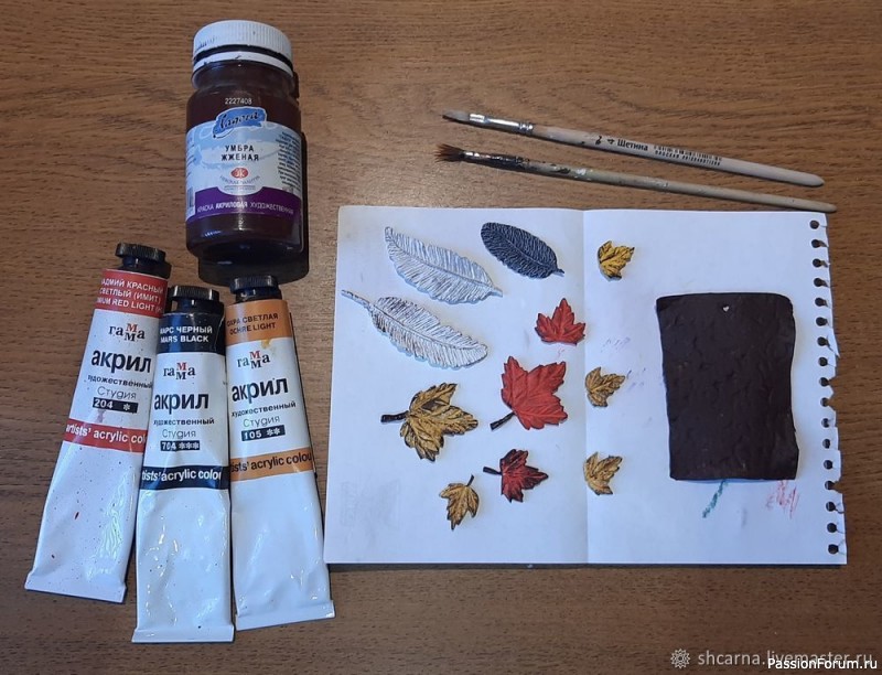 Ну а теперь... Самый ключевой момент, когда все детали, наконец-то, готовы, основа тоже высохла, и мы начинаем итоговую сборку! Клеим листики и перья, а потом сухой кистью проходим страницы белой акриловой краской, а всю остальную поверхность золотой акриловой краской. И вот он, итог наших стараний!