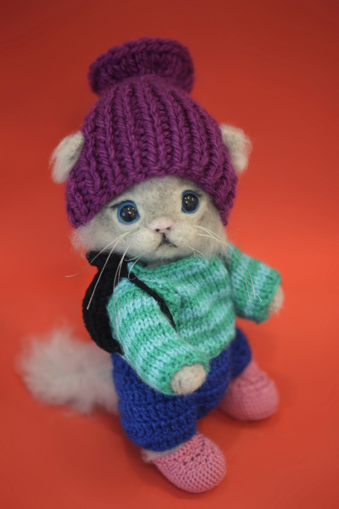 Котенок в одежде связан крючком из акриловой пряжи. Размер - 21 см. На каркасе из проволоки, все части тела сгибаются. Одежда снимается.