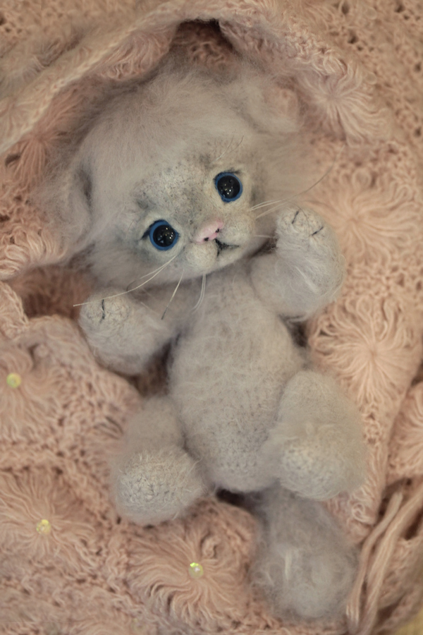 Чудесный котенок! И техника исполнения интересная.Это Вы все вяжете из одной пряжи, а потом начесываете шерстку, чтобы она пушилась или пряжа все же комбинированая? На мордочке такая плотная вязка, что почти не видно петелек, как будто это привалено.Здорово! Удачи Вам в творчестве и легких петелек!