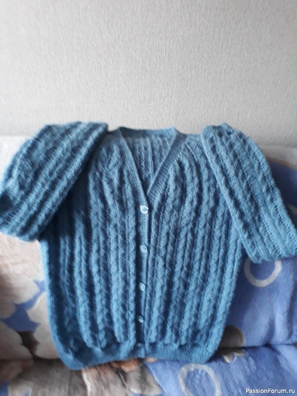 связала на заказ спицами кофточку на пуговках с низу вверх, планку вязала сразу, спинку и полочки одним полотном