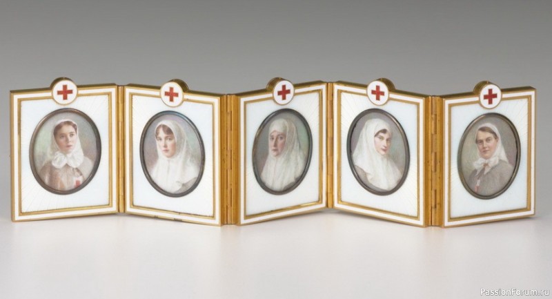 На портретах изображены члены семьи императора Николая II в форме медицинских сестёр: