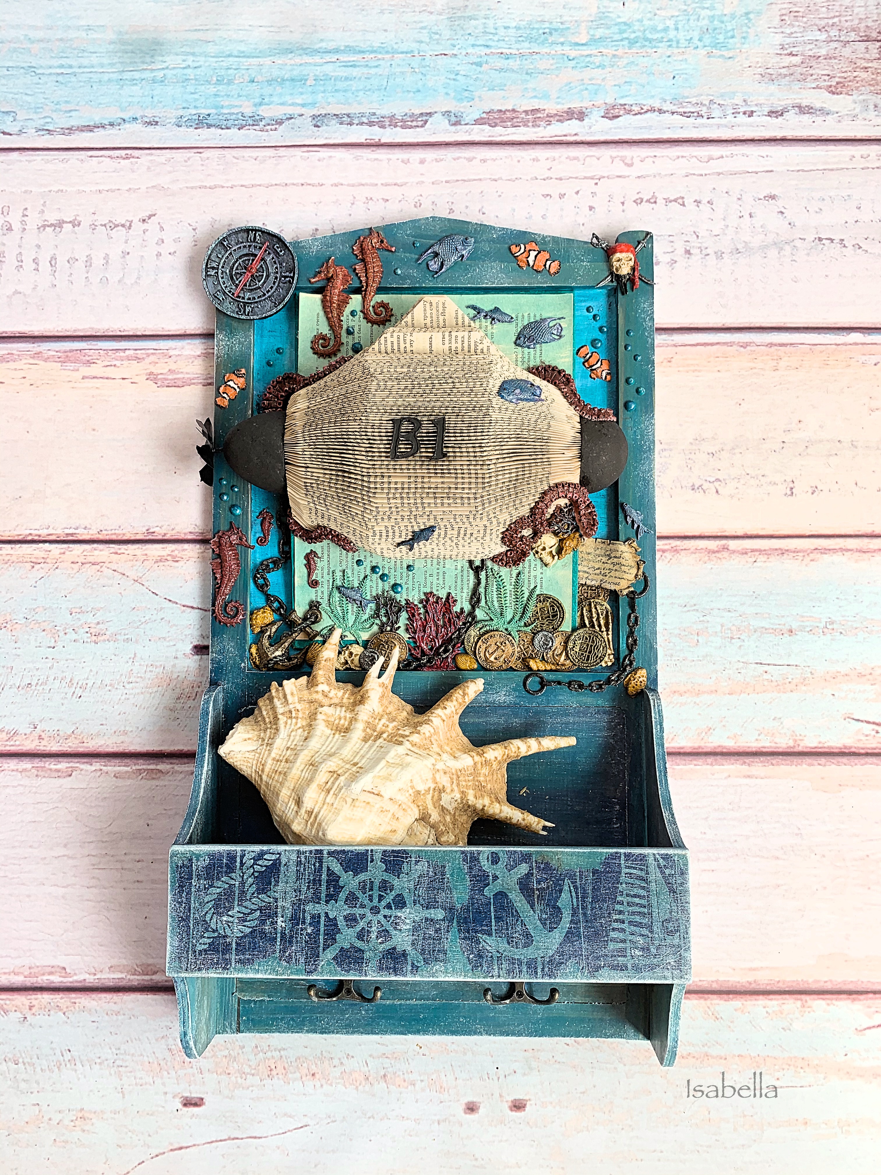 Как мне понравилась твоя подводная лодка Белла! Идея супер! Полка-ключница такая практичная и ты так хорошо придумала на окантовке сделать такой не яркий трафарет- он меня больше всего зацепил. Интересно придумала с щупальцами осминога- такие реалистичные! Все детальки привлекательные, интересные, но у меня есть одно маленькое замечание, как ты выразилась- дно «перегружено и завалено» на мой взгляд- можно было бы еще под ним продолжить декор или хотя бы сделать трафарет на морскую тему, чтобы зрительно было продолжение дна вниз. Я бы нарисовала водоросли или кораллы.