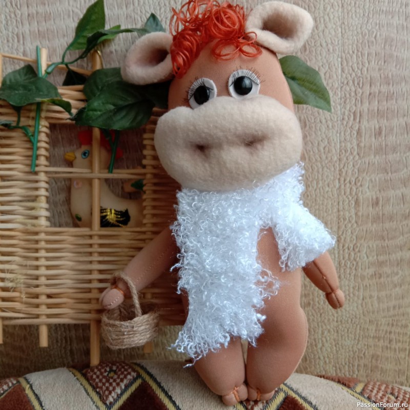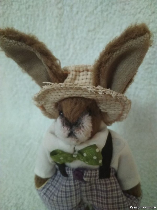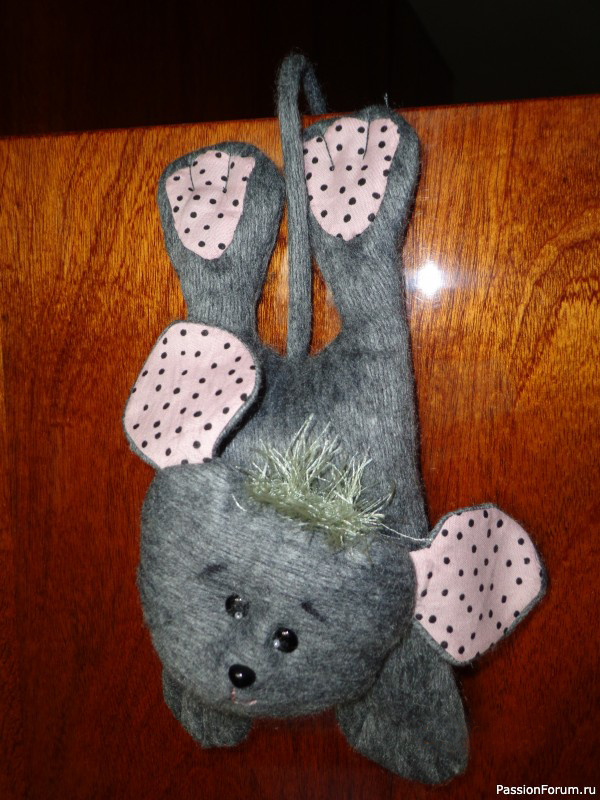 Сшит из флиса, меха и фетра. Наполнен синтепоном. В нижнюю часть ног вставлены стеклянные цветочки, а в попу гайка 24, для утяжеления, чтобы стоял.