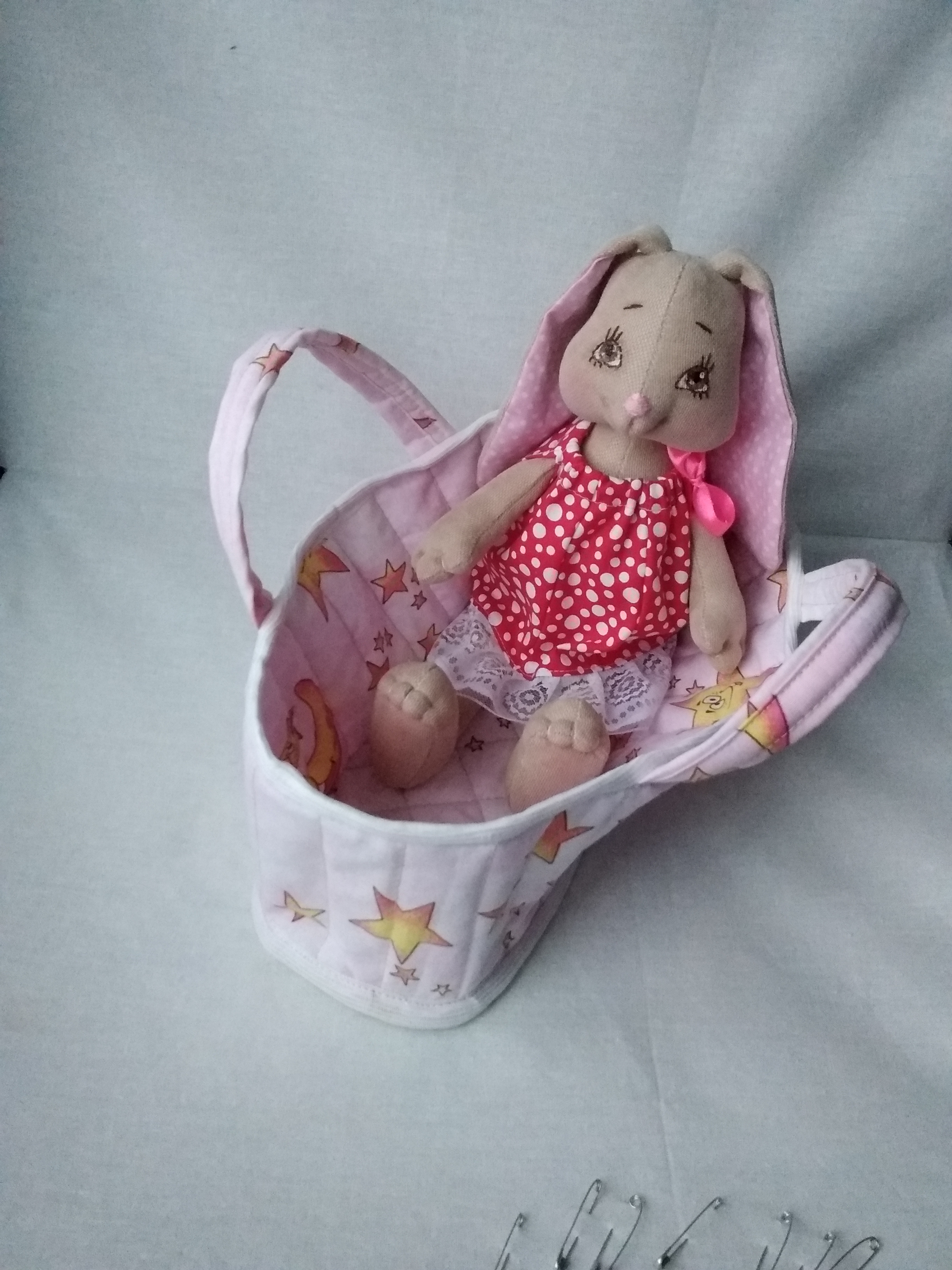 Сшита из бязи, рост игрушки около 25 см (без ушек).Ручки-ножки на пуговичном креплении.Носик сделан отдельно и приклеен.Глазки — бусинки и фетр.Наряд из плательного ситца и атласной ленточки, волосы из пряжи.Под платьицем у Заюшки красивые панталончики