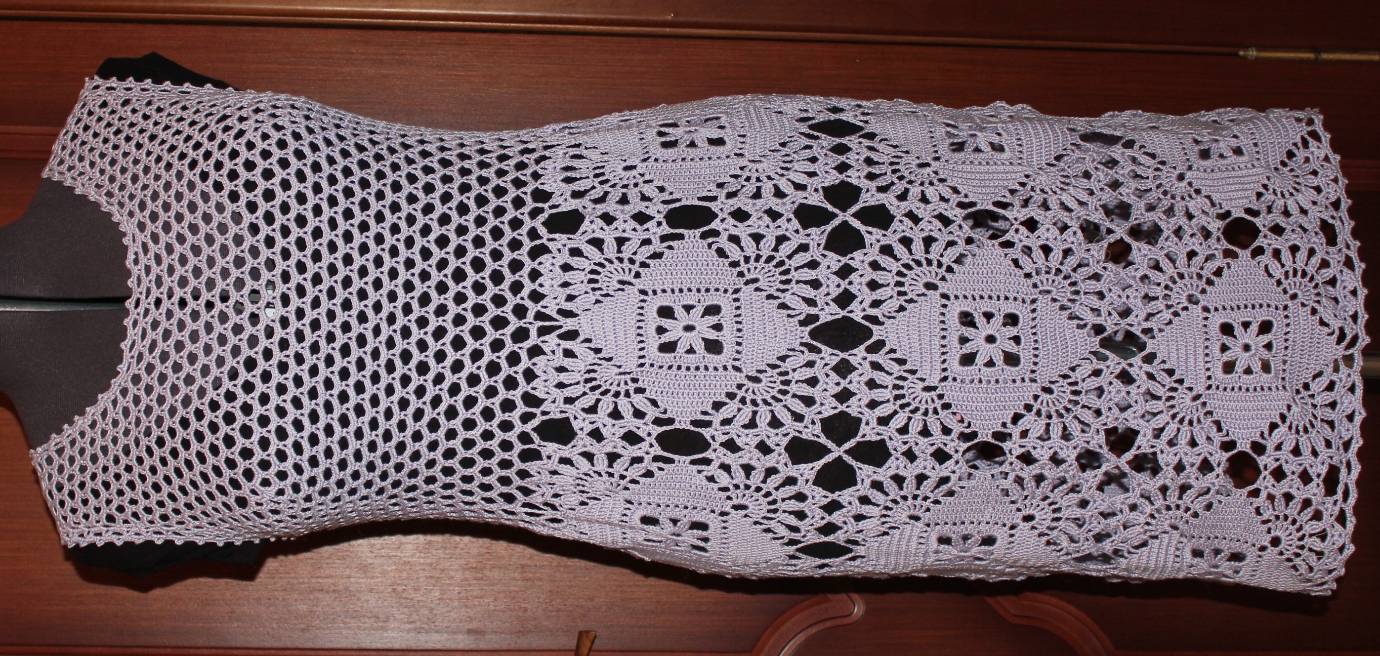 Платье увесистое, хорошо облегает и держит форму. Цвет мой любимый, лавандовый. Качество пряжи мне очень понравилась. Нить ровная, гладкая, под крючком не расслаивается, хоть и не крученая. Цвет нити во всех моточках одинаковый.