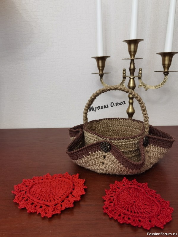 Давно собиралась, но только в этом году руки дошли или я созрела. В центр можно пасху расположить или сладости по периметру в кармашки крашеные яйца.Связана крючком из джута обвязана натуральным хлопком.