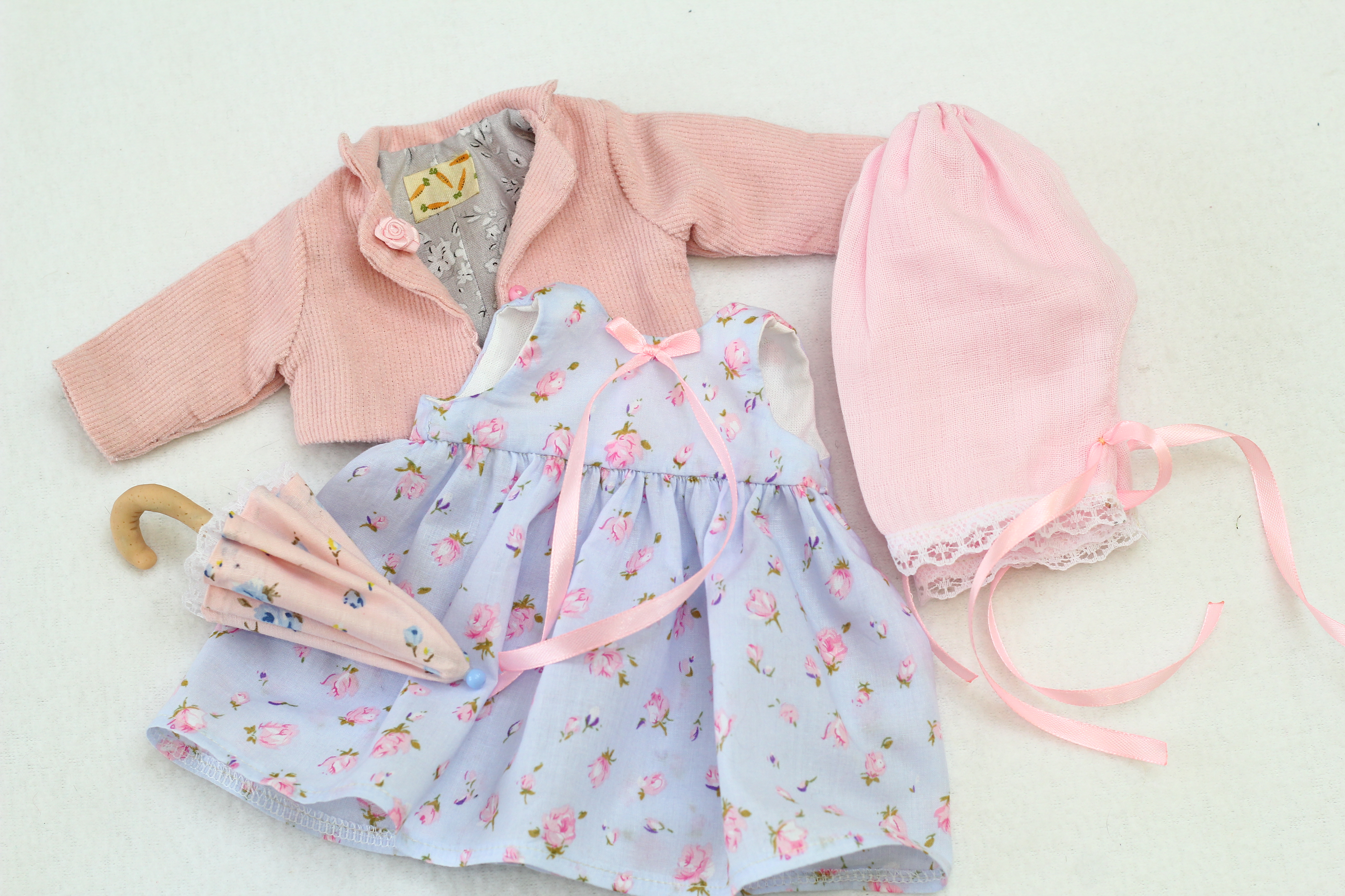 Наряды Крольчихи:Платье из хлопка, Пиджак из микровельвета, Панталончики из муслина, Зонтик.
