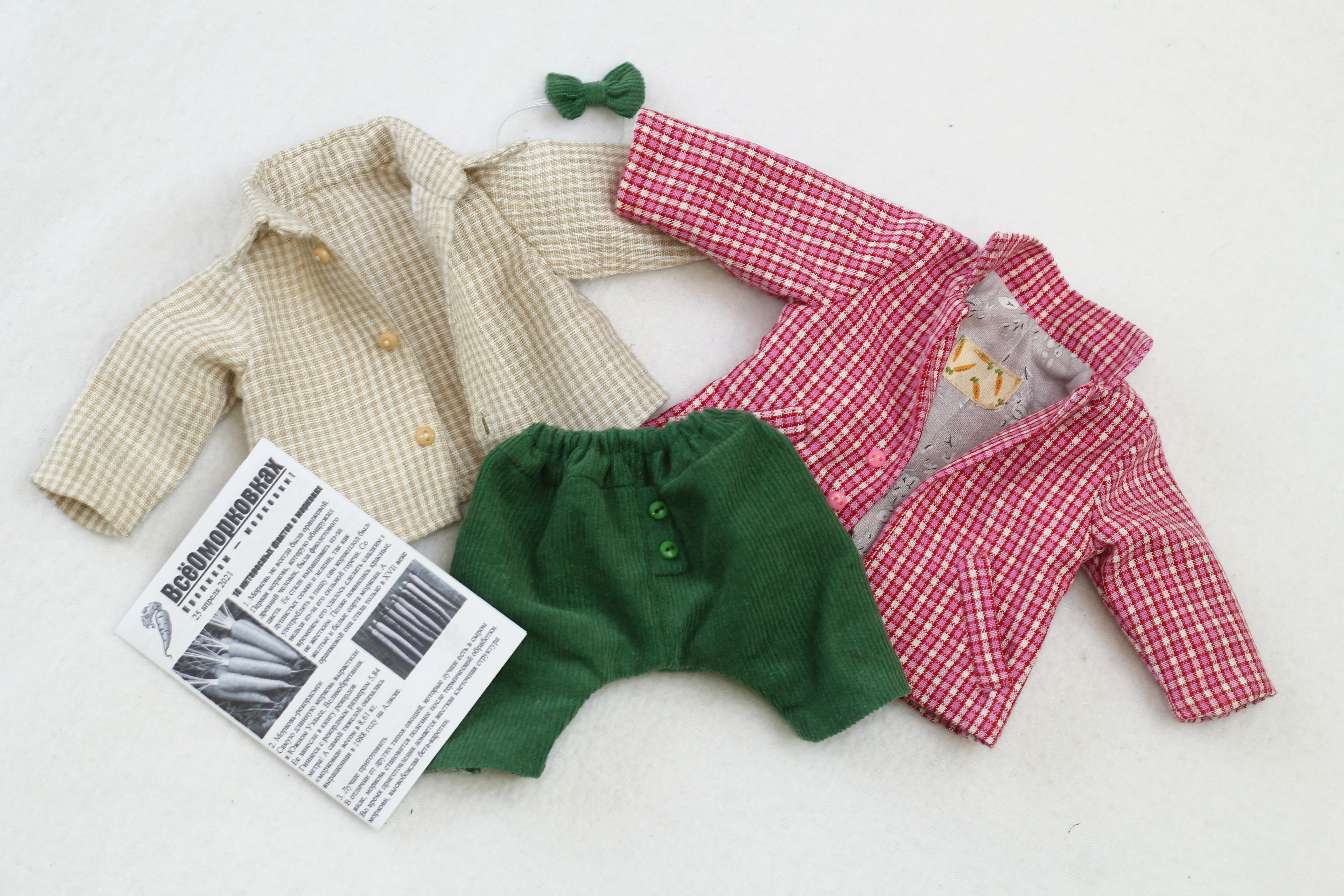 Наряды Кролика: Штанишки из микровельвета, Рубашка из полульна, Пиджак из полульна, Галстук-бабочка, Газета"ВсёОМорковках", Ключ от норки))) и газета "ВсёОморковках"