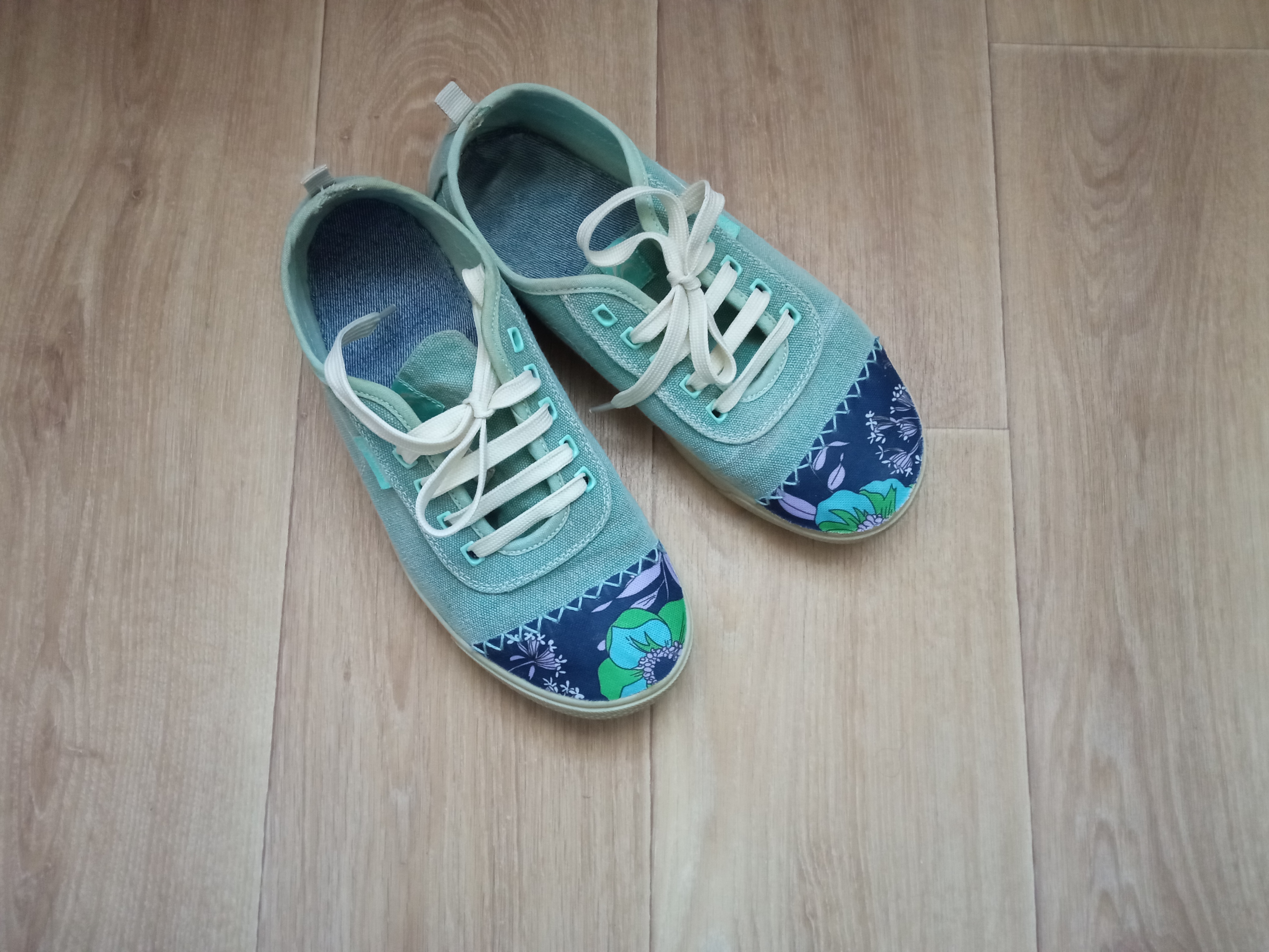 Здравствуйте! Сегодня я с ремонтом текстильной обуви, идею подсказал интернет. Поставила ( а вернее приклеила) на свои старые мокасины цветастые латки и прошла декоративным швом. Мне повезло - нашла родственный по цвету лоскут кремплена, он хорошо пружинит и не сыплется. Ремонт занял полдня неспешной работы.