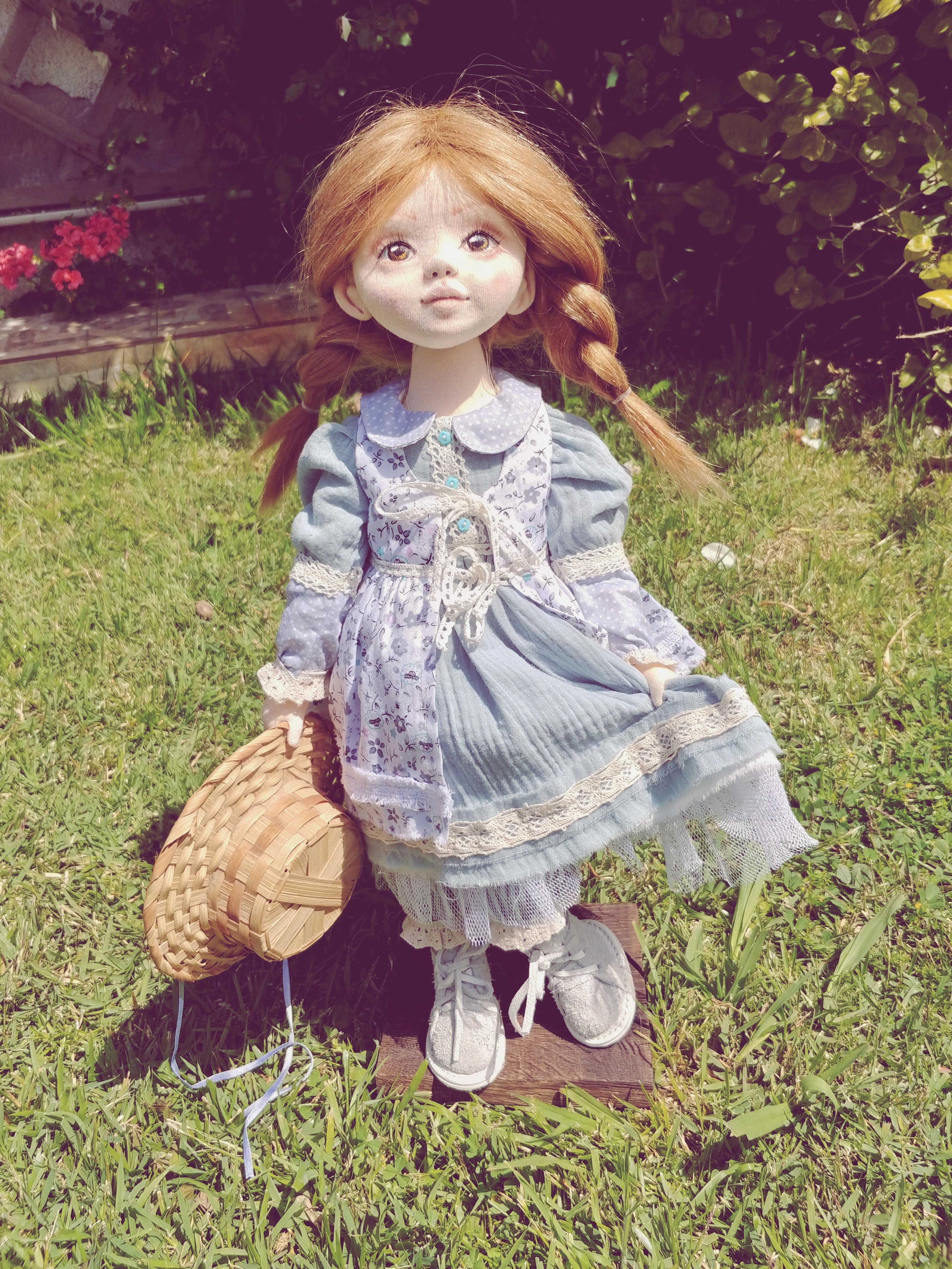 Даша умеет сидеть .Стоит на подставке.Куколка подвижная - сгибаются ручки и ножки, поворачивается голова и сгибаются пальчики.Расписана вручную акрилом, пастелью и акварельными красками.
