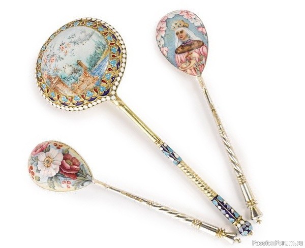 Три серебряные ложки с позолотой, украшенные перегородчатой и живописной эмалью, О. Курлюков, Москва, около 1899-1908 гг.