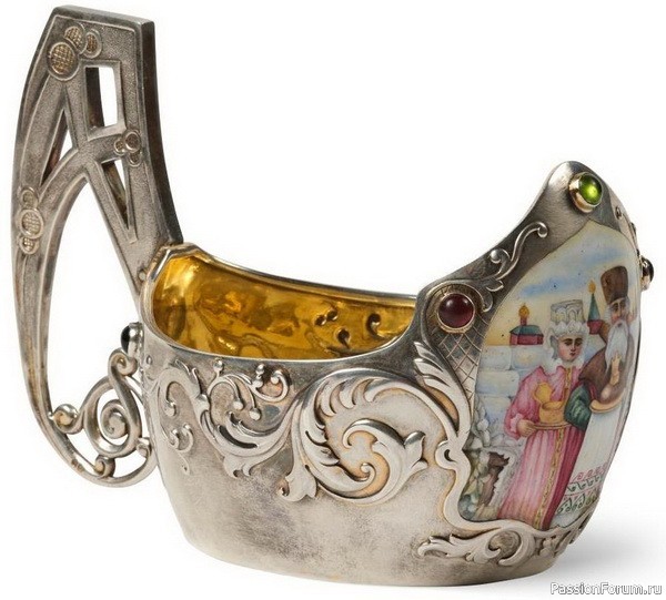 Серебряный ковш, украшенный хризопразами и живописной эмалью, О. Курлюков, Москва, 1899-1908 гг.