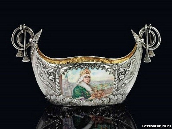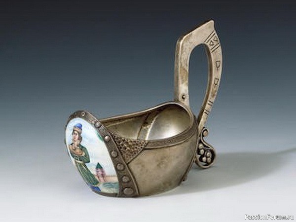 Серебряный позолоченный ковш с изображением боярышни, украшенный а перегородчатой и живописной эмалью, длина 19,8 см, О. Курлюков, Москва,1899-1908 гг.