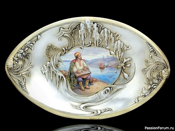 Серебряное позолоченное блюдо с изображением Садко перед Ильмень-озером, украшенное живописной эмалью, длина 40 см, О. Курлюков, Москва,1899-1908 гг.