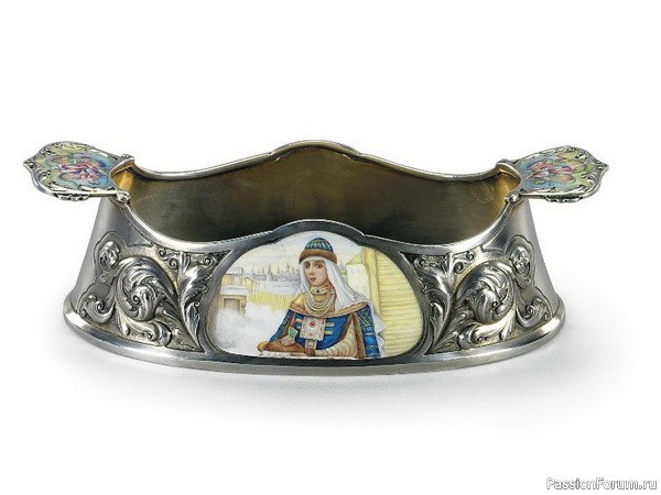 Серебряная чаша, украшенная живописной эмалью, ширина 28,5 см, О. Курлюков, Москва, 1908-1916 гг.