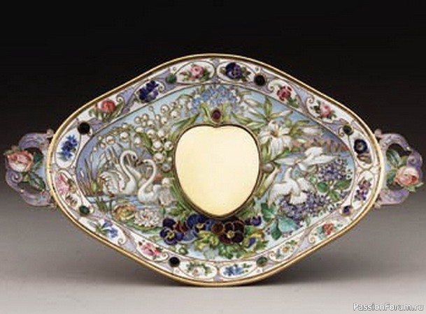 Серебряное позолоченное блюдо с ручкой, украшенное драгоценными камнями, перегородчатой и живописной эмалью на сюжет сказки «Садко», О. Курлюков, Москва, 1899-1904 гг.