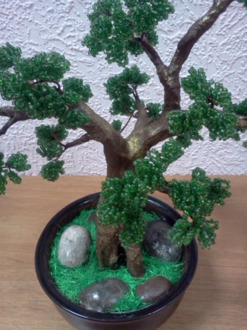 У шефа в сентябре был юбилей - 60 лет. Я с нового года увлекаюсь бисером, приносила свои поделки и на работу. Шеф с таким интересом их рассматривал, что вопрос подарка даже не стоял. Конечно дерево из бисера. Выбрала бонсай, Как-то именно он ассоциировался с ним больше всего. Работа заняла больше трех недель. Но результат того стоил.