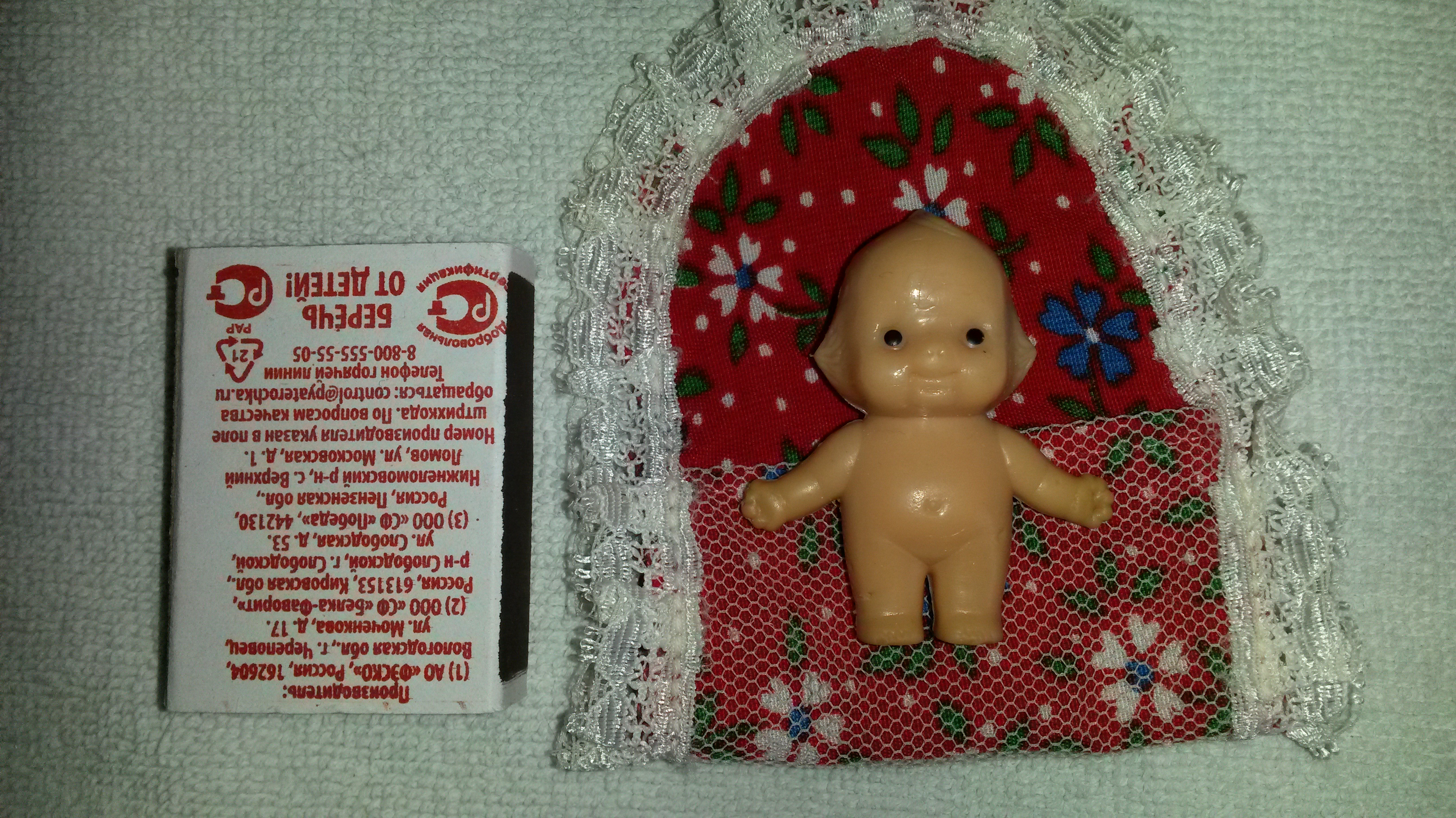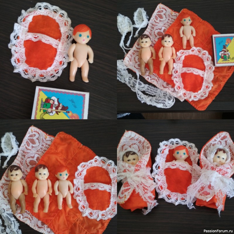 Добрый день, Татьяна! Я обещала показать пупса-близнеца вашему малышу, Была у родителей, отыскала своих пупсов из далёкого детства, которым точно больше 40 лет. К сожалению близнец вашему не сохранился, хотя точно был, но нашлись его друзья. Тот, что в конверте так и продавался, а два других были голышами, я им в классе 4-5, когда училась строчить на машинке, пошила чепчики из гипюра и одеяльца из банта. Сейчас пишу и улыбаюсь, как давно это было и как приятно вспомнить. Спасибо вам за то, что напомнили и вернули возможность немножко поиграть.