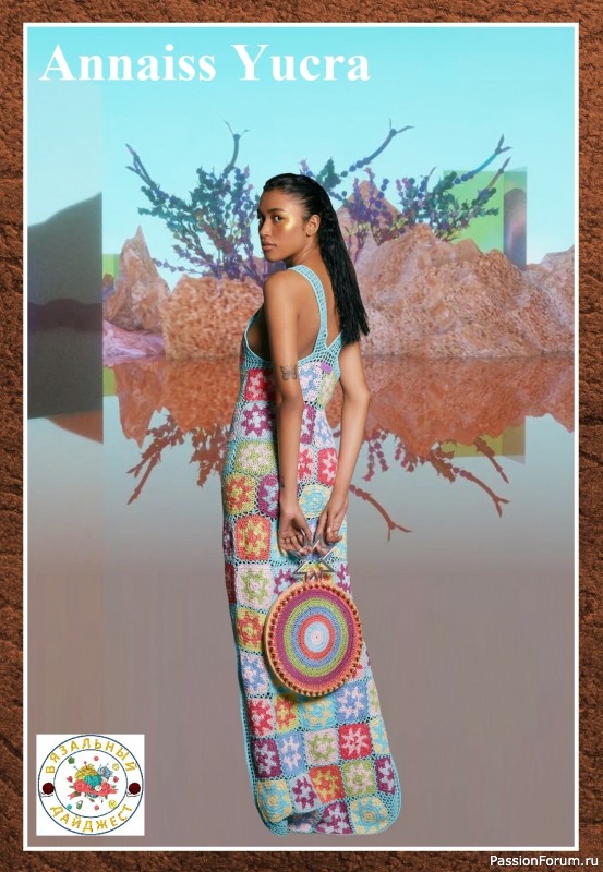 квадратных мотивов дополнено оригинальной яркой круглой сумочкой, связанной крючком. На мой взгляд платье очень лёгкое летнее, хорошо смотрится на загорелой коже.