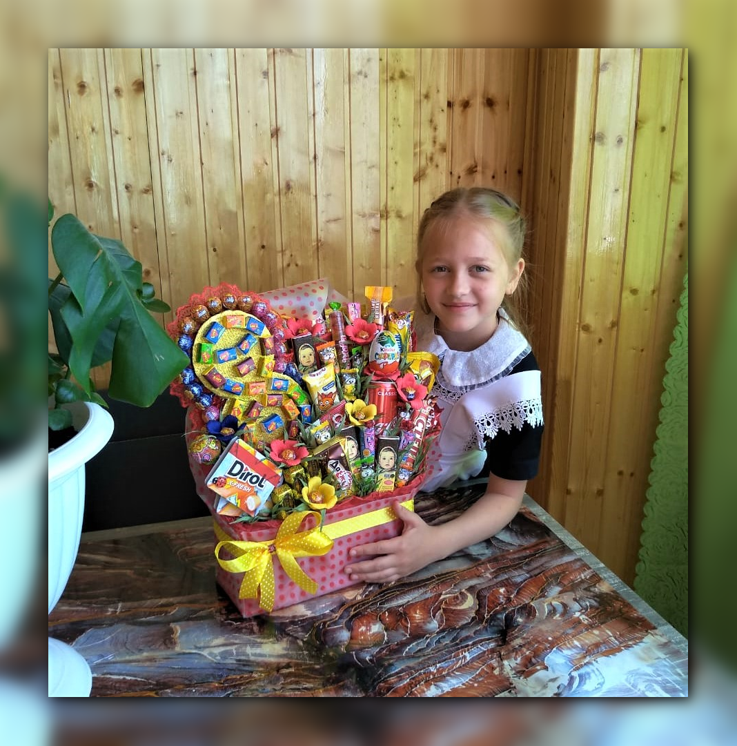 Подарок из сладостей готовился для любимой внучки. Вчера ей исполнилось 8 лет. Сладости она уплетает как саранча травку)