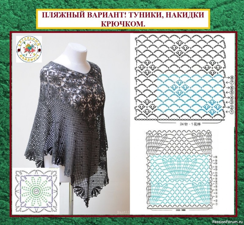 Ещё один вид туники-накидки, которая напоминает пончо и вяжется углом, совмещая раз-личного рода мотивы и ажурные полосы. Очень удобны и оригинальны в летнем гардеробе.