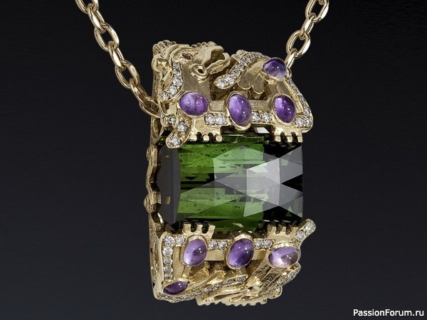 Подвеска с турмалином «Драконы ацтека». Желтое золото, бриллианты, турмалин (Бразилия), аметисты, рубины.
