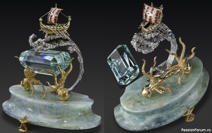 Композиция «ВОЛНА». Золото, бриллианты, эмаль, серебро, золочение, аквамарин 611,35 кт (Южная Америка).