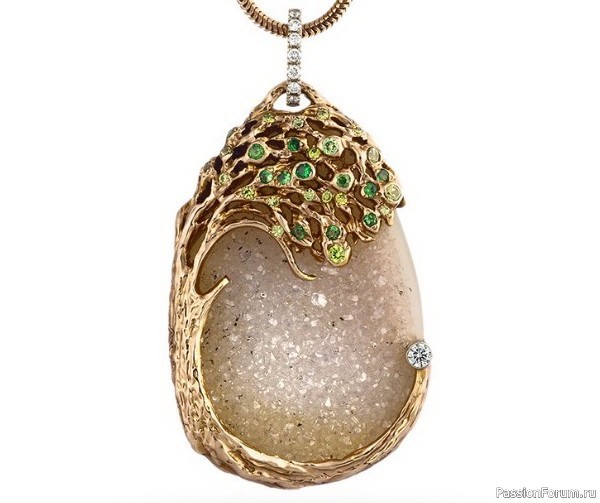 Подвеска "Райское дерево". Желтое золото, бриллианты, демантоиды, кварцевая друза.