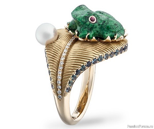 Кольцо "Лягушка на кувшинке". Желтое золото, бриллианты, культивированный жемчуг, резьба по жадеиту.