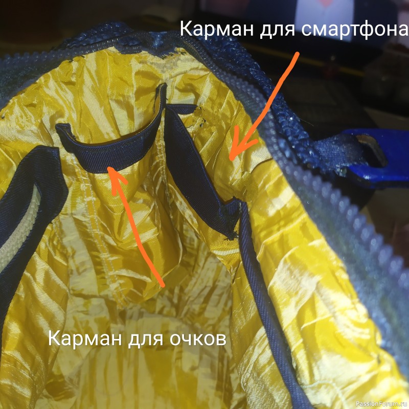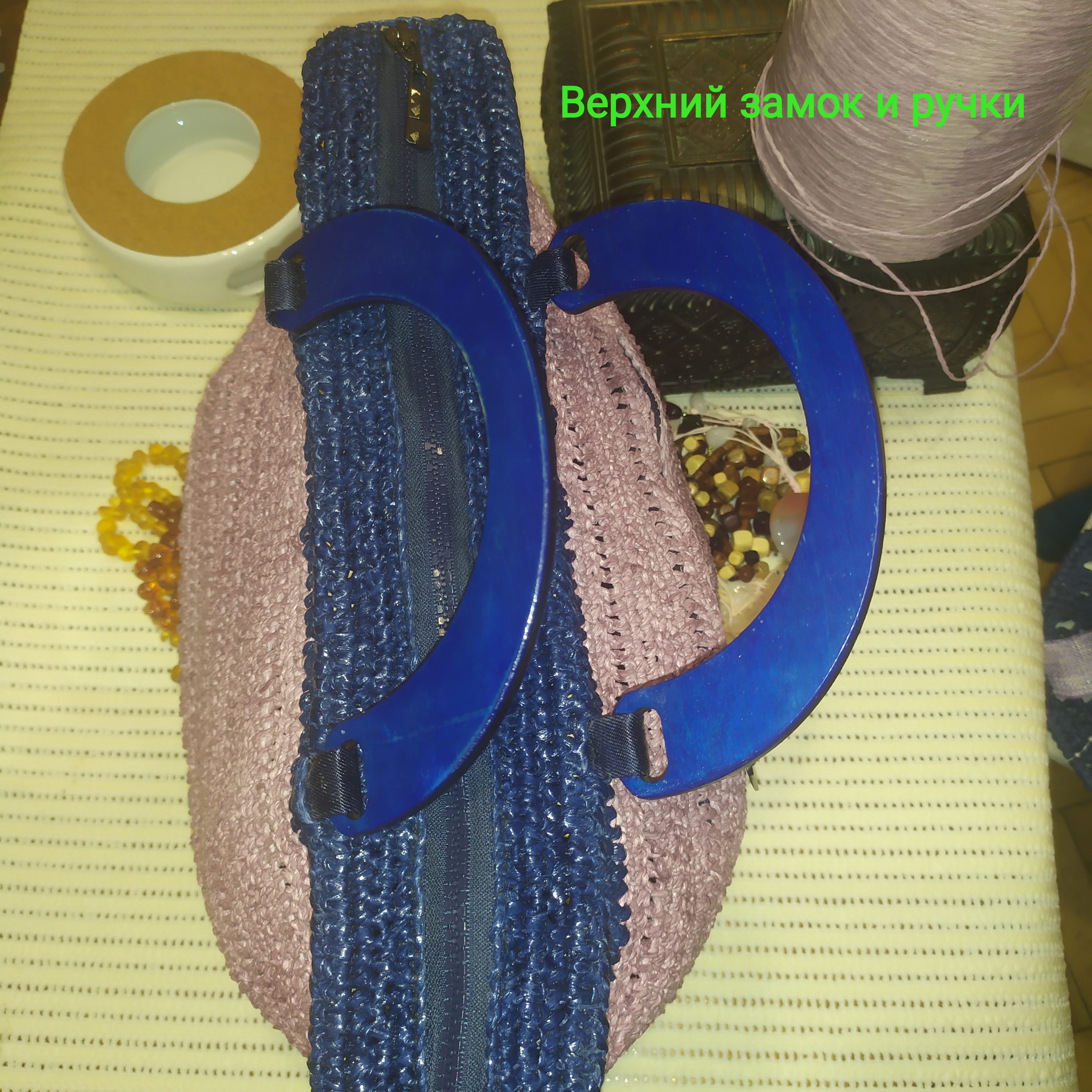 Чтобы не было пестроты, ручки покрасила синькой для белья и тоже покрыла акриловым лаком. Покупное донышко не стала красить, а только покрыла лаком. Подкладку сшила из очень крепкой и лёгкой светлой однотонной синтетической ткани. Как всегда, в моей сумке много карманов (не пользуюсь никакими кошельками, косметичками, футлярами для очков):
