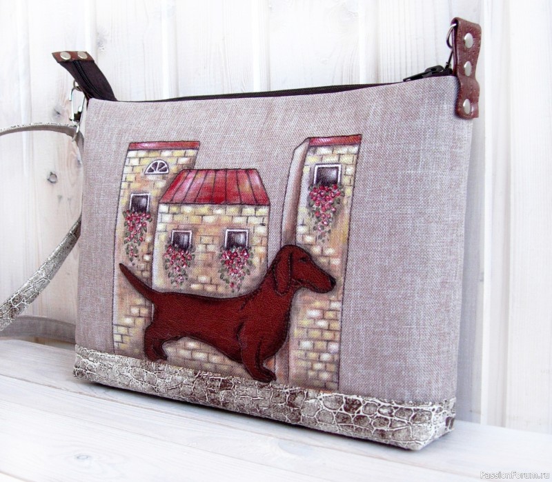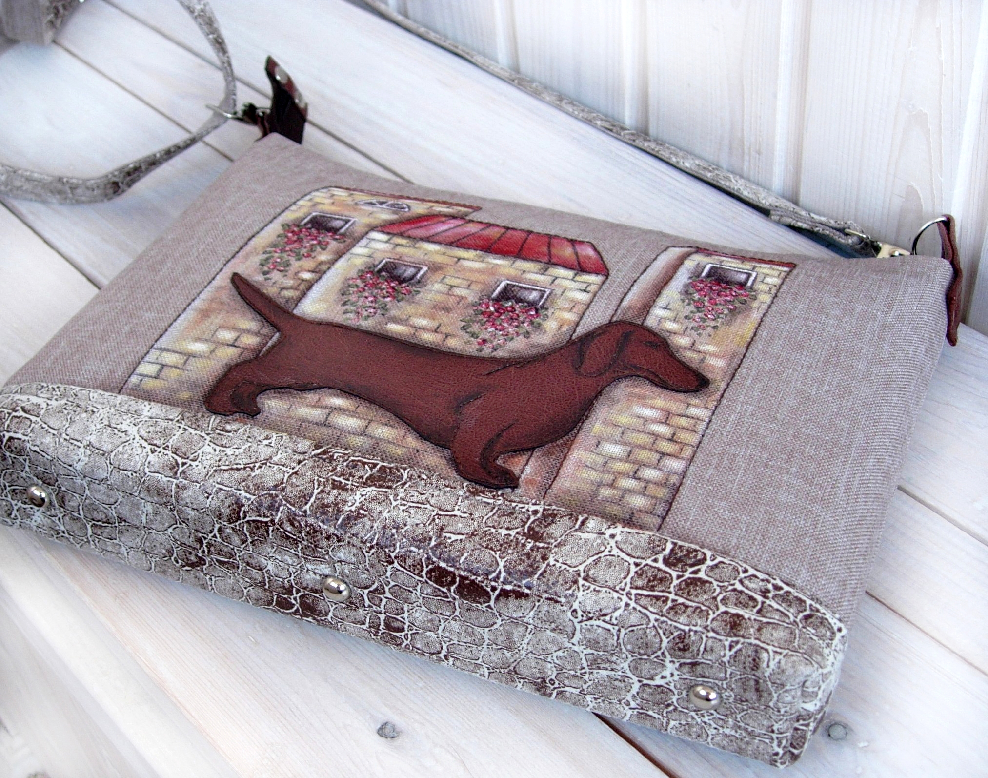 Вот такой клатч "Прогулка" - Такса гуляет на фоне "Тосканских домиков"))) Только на этот раз аппликативно сделана только такса, а домики прострочены и расписаны прямо на ткани)