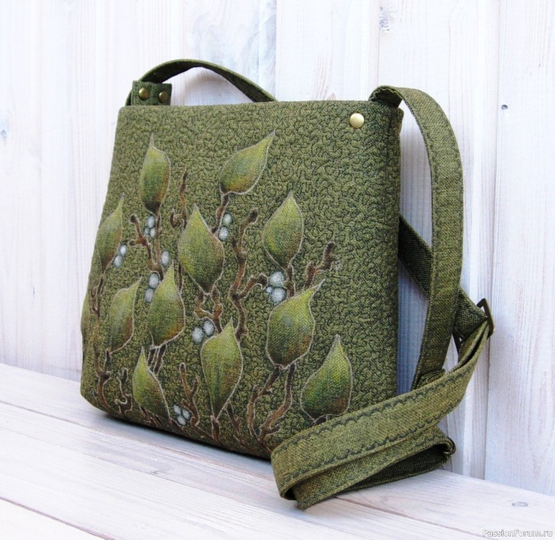 Сумка "Лаванда" Очень интересная жаккардовая фактурная ткань в качестве основы -таких мшистых оттенков с вкраплениями древесных островков зелени)))И среди них веточки лаванды -так придумала сама заказчица,а я постаралась воплотить) чУдно получилось))