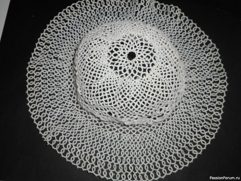 Шляпа, сплетена в технике фриволите, по схеме из книги Нины Курбатской "Фриволите", челноком и ниткой от клубка, нитками Снежинка