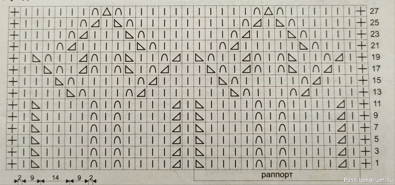 Раппорт узора 14п.+15п.+2кром. Спицы №3.На схеме приведены лицевые ряды.В изн.рядах петли вязать по рисунку, накиды провязывать изнаночными петлями. Повторять с 1 по 28 ряд.