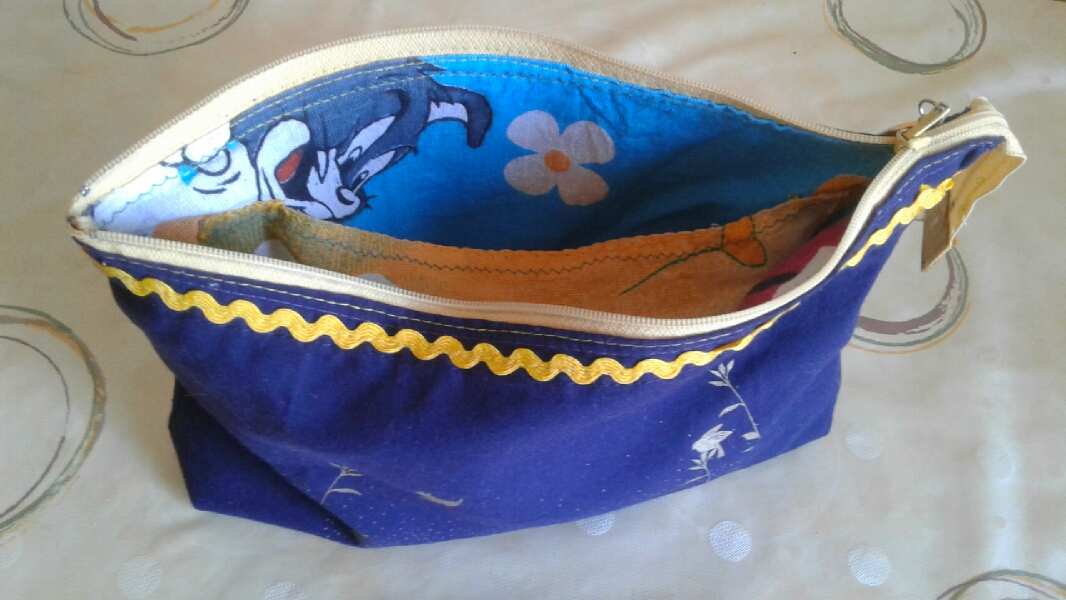 Пошила косметичку размером 24 на 15,5 на 4,5 см. на подкладке, с двумя отделениями и с замком контрастного цвета.Использовала хлопчатобумажную ткань и дублерин для лучшего вида и формы.Косметичка красивая, легкая и вместительная.