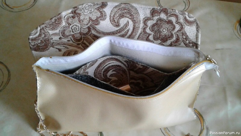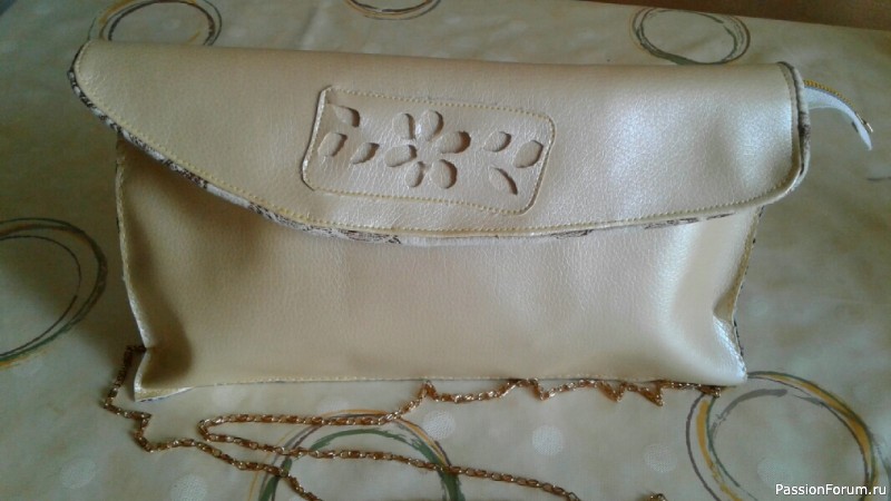 Пошила вместительный клатч из золотистой,тонкой кожи и плотной цветной ткани. Клатч на 3 отделения,размером 28 на 17 см. Ручка -цепочка на карабинах.Замочек золотистый пришит двойной строчкой.